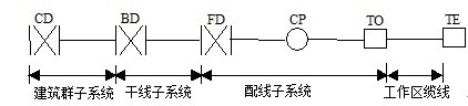 圖為綜合布線系統的基本組成結構圖。其中,CD為建筑群配線設備,BD為建筑物配線設備,FD為樓層配線設備,CP為集合點,TO為信息插座模塊,TE為終端設備。
