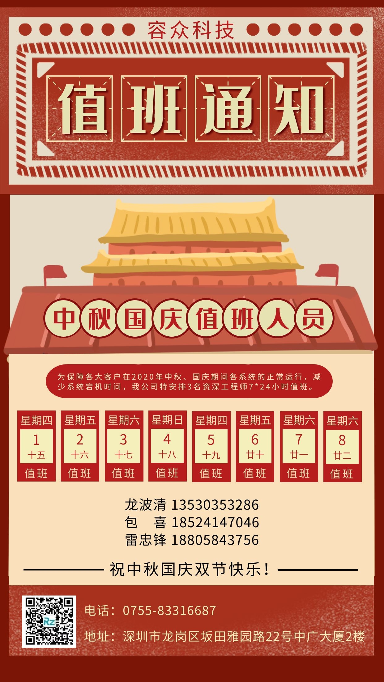 容眾科技 | 中秋國慶值班表